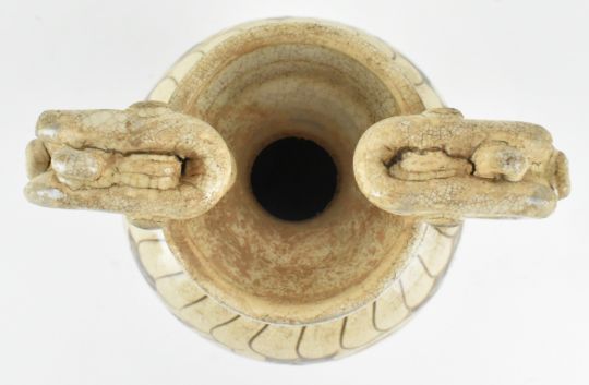 A Cizhou kiln incised twin handle pottery vase. The vase has a flared mouth and ovoid body, decorated in incised flowers on the body, double strap dragon handles. Measure approx. 24cm tall.
