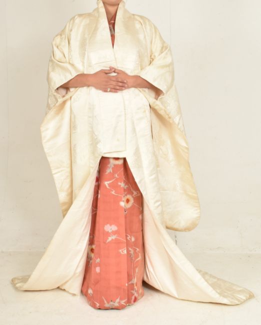 A 20th century vintage Japanese wedding kimono uchikake. The large flowy heavily jacquard robe decorated with cranes and cherry blooms throughout and padded along the hem; ikake is also a large, flowy dress-like robe and is meant to be larger than the kimono worn under. Measures approx. 190cm long.