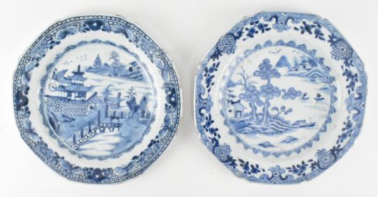 A collection of four Qing dynasty blue and white plates. The lot comprising an rectangular octagonal charger plate decorated with landscape, two octagonal plates with decorated with landscapes , and a circular ogee plate decorated with peonies and bamboo in the centre. The largest charger plate has been restored. Largest measures approx. 3cm tall x 33cm long.