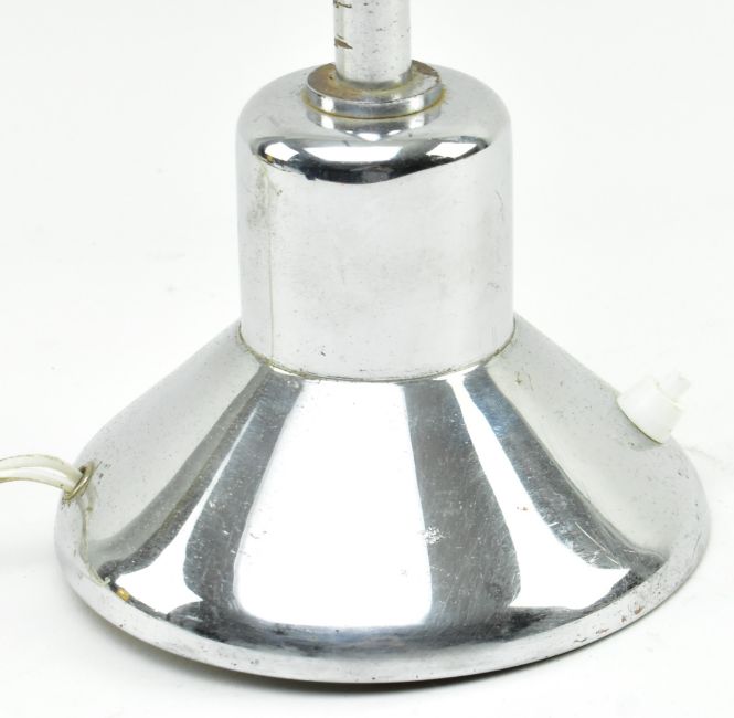 A retro 20th century industrial / office chrome desktop gooseneck lamp light. The lamp having a domed shade upon a gooseneck arm with all raised upon a circular base.