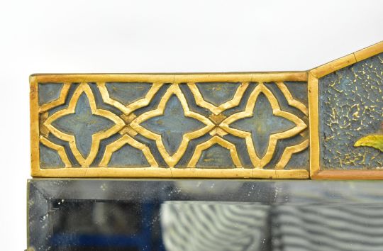 An Art Deco 20th century gilt & painted wood wall hanging mirror. The mirror having a shaped pediment atop with floral embellishments flanked by relief geometric patterns to frame. Central bevelled edge mirror plate. Further moulded lower frame.