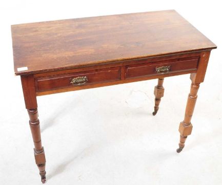 19th century Victorian mahogany writing desk. The desk having twin drawers, each with brass swan neck handles and being raised over turned supports. Brass handles to the drawers.