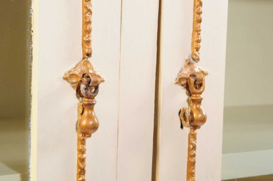 A painted 20th century French armoire bookcase display cabinet. Rectangular form with twin glazed front with wooden shelved interior. Atop a rectangular base with cabinet doors. Having gilt border surround with motif sun burst. Raised on rectangular feet with droplet metal pull handles.