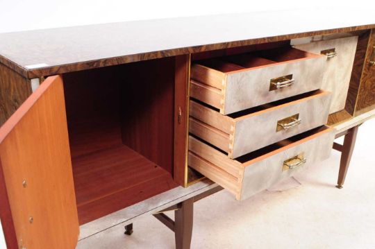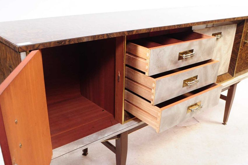 British Modern Design - Mid century sideboard credenza. Two tone formica finish in faux wood and marble. End cupboards with central bank of drawers.