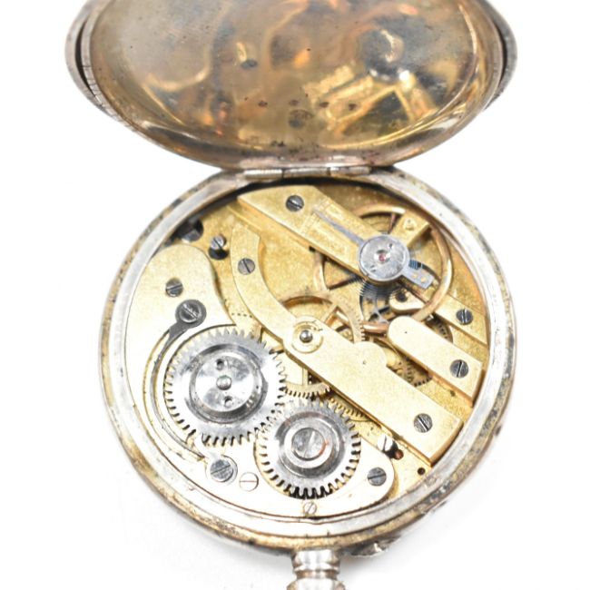 Four silver pocket watches and accessories. The lot to include a Victorian hallmarked silver pocket watch having Roman numerals, blue hands and dial signed La Trobe, 35 College Green, Bristol to polished silver case with glass front panel, hallmarked for Birmingham, 1884. A hallmarked silver pocket watch with yellow tone metal decorative dial to silver engine turned case with vacant cartouche, hallmarked to inner case for London, 1916. A Swiss hallmarked silver full hunter pocket watch with foliate engraving to the case to metal inner case, hallmarked with pre-1933 Swiss hallmark for 800 silver and inner case marked METAL. A silver pocket watch AF with loose glass, marked silver to inner case. The lot to also include two metal chains, a leather and chain strap and various watch keys. Largest watch measures 7.5cm x 5cm. Smallest watch measures 6cm x 4.5cm. Total weight 483g. All weights, measurements and sizes are approximate.