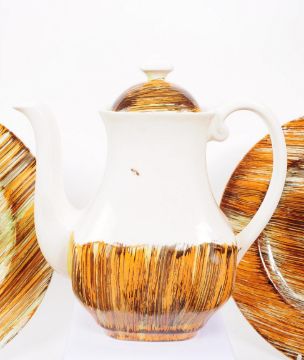 Bristow Chillington - A mid centruy ceramic tea / coffee service set. Including teapot, saucers, cups, plates, milk jug, sauce jug and sugar bowl. Stamped Enlgand to base, with striped autumnal colours.