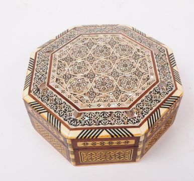 Two vintage 20th century Egyptian mother or pearl and walnut jewellery boxes. With mosaic patterns, and intricate geometric patterns on a hinge lid with a red interior.
