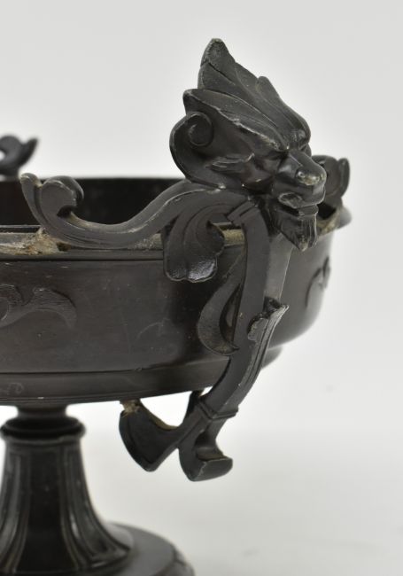 A Victorian Grand Tour late 19th century cast bronze figurative tazza urn centrepiece. The tazza having figurative dragon head shaped twin handles with scrolled details. Circular tapering body with fox head embellishments. All raised on circular foot.