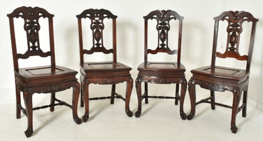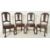 A French continental early 20th century carved oak extending dining table together with a set of four chairs. The table having a squared chamfered edge top over five reeded turned flared supports with side carved panels. No leaf present. The set of four 20th century hardwood dining chairs having flip over panel seats. Each chair having a scrolled top with central carved back splat flanked by straight supports. Shaped seat having a central panel turning with paneled seat on one side and cushioned upholstered seat on the other. All raised on carved supports with ball & claw feet united by H shaped block and turned stretcher.