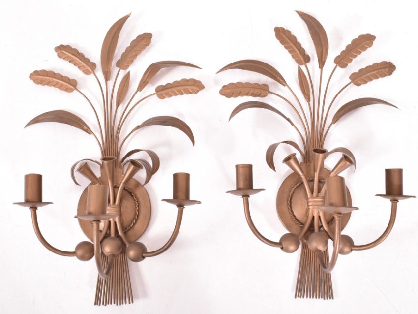 A pair of retro late 20th century Hollywood gilt metal wall sconces. Each sconce with sprawling leaf decoration over a three arm sconce section below supported by a rounded wall mount. Sold as untested.