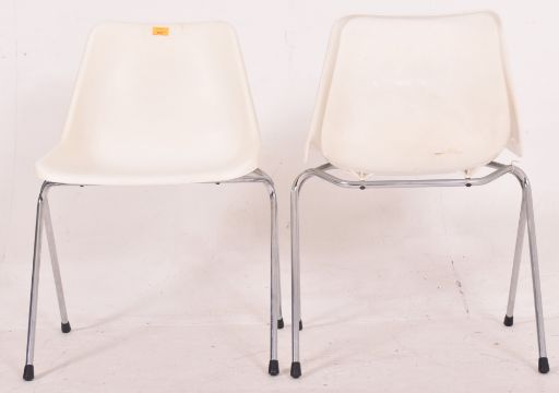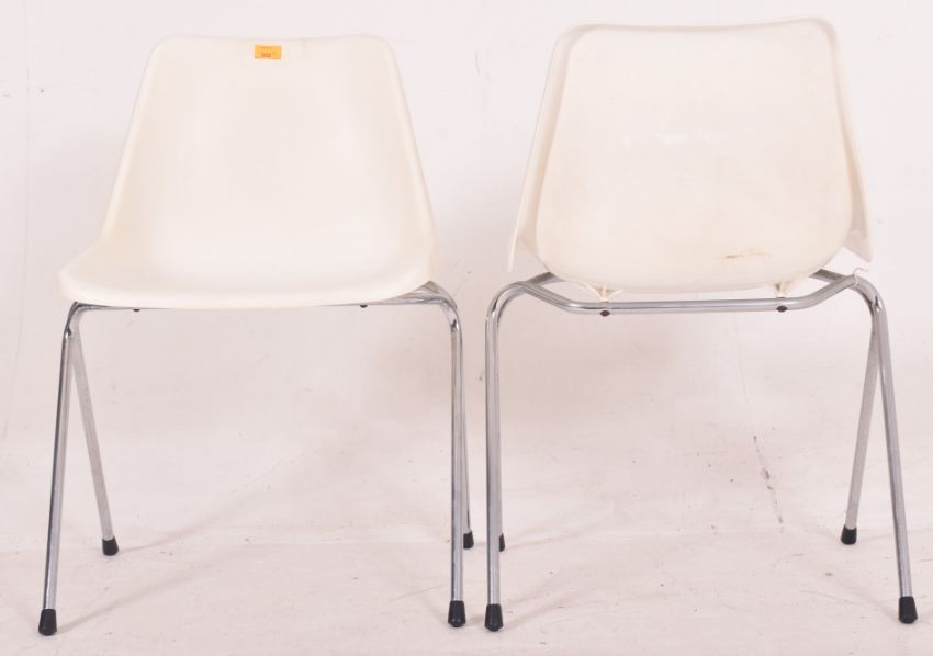 Robin Day for Hille Furniture - a set of three retro mid 20th century moulded acrylic & chrome stacking chairs. Each chair having a white moulded seat raised on chrome tubular supports.
