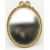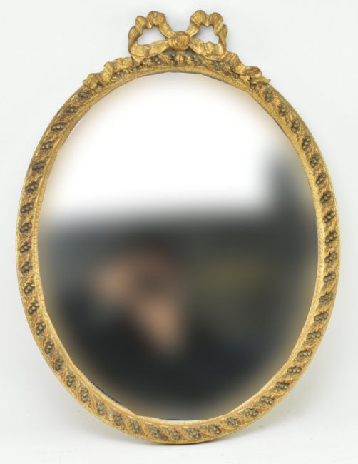 A French inspired early 20th century giltwood framed oval wall mirror. The mirror having a ribbon shaped embellishment atop over foliate decorated oval frame with hints of red paint throughout. Central bevelled edge mirror plate.