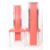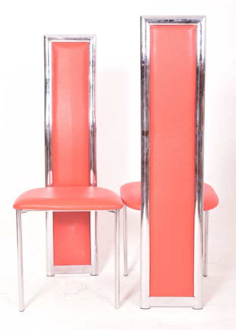 An Italian modern design glass, chrome & red painted dining table. The table with chrome & glass extending top raised on three chrome squared columns on rectangular base. The chairs with faux red leather floor length back panels framed in tubular chrome supports.