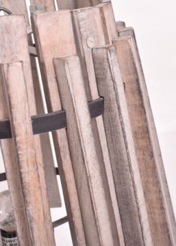 A vintage 20th century Scandinavian style wooden & metal ceiling chandelier light of bucket form. The chandelier of tapering circular form with wooden inner circumference and metal bound outer wooden shade. Three armed light bulb holder to inside. Sold as untested.