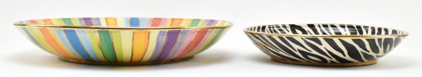Mary Rose Young - two vintage late 20th - early 21st century oversized studio pottery ceramic wall chargers / fruit bowls. The lot to include a smaller bowl with zebra border design surrounded central colourful bullseye design, and the laarger with bright vertically striped border and central spotted design. Each with historic damage & repair. Signed in gilt & dated to underside.