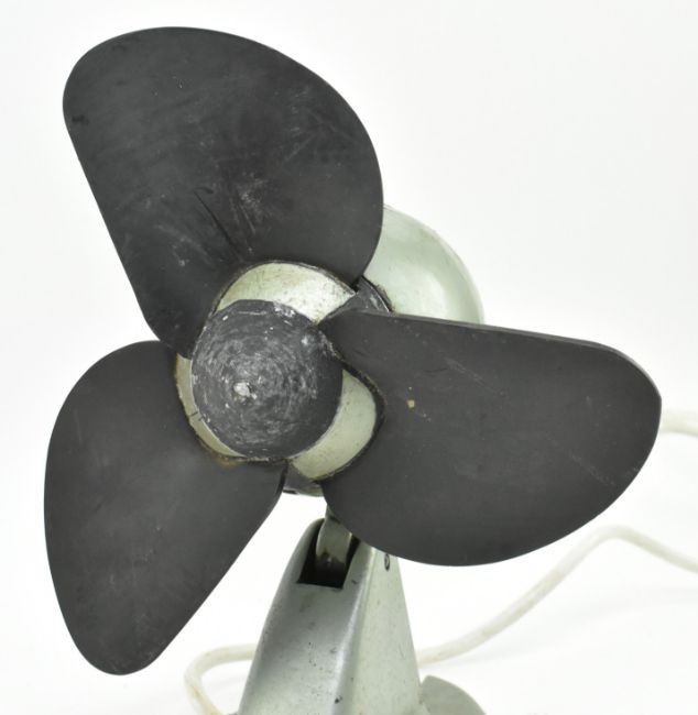G. E. C. - a retro mid 20th century 1950s - 1960s industrial space age desk / table top fan. The fan having a rubber blade with a metalic green finish to the metal body. Label to the base for the Genral Electric Company. Sold as untested.