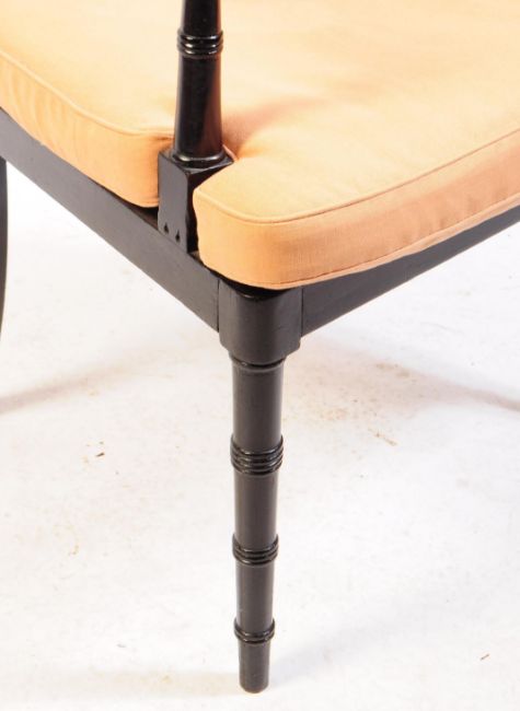 19th century Regency George III ebonised mahogany carver desk chair. Raised on turned legs with overstuffed seat having railed back rest with shaped elbow rests either side