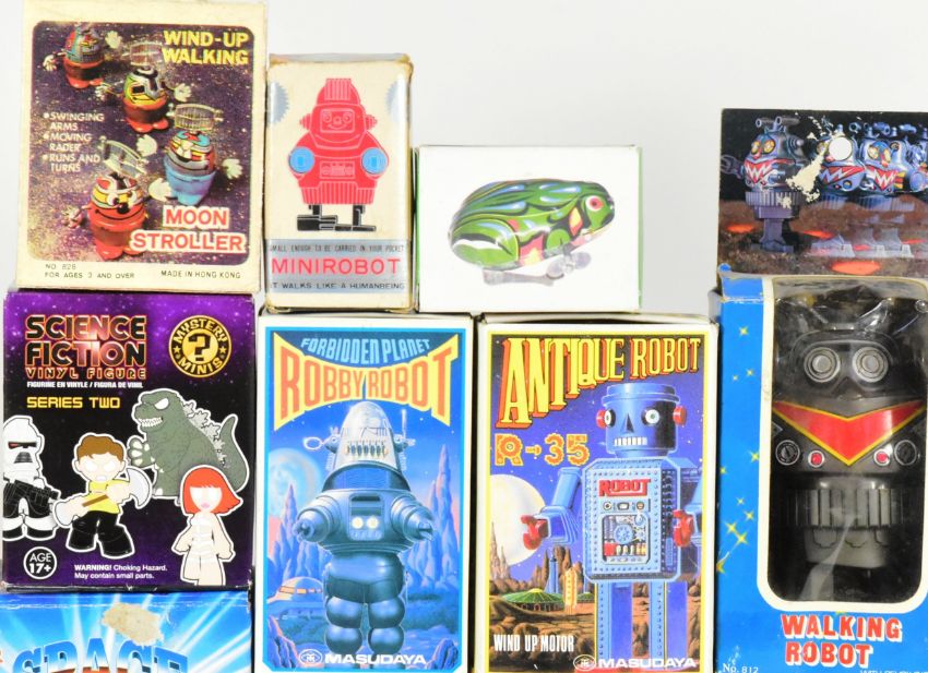 Tinplate Toys - a collection of assorted wind-up robots, to include: 'Antique Robot R-35' by Masudaya, 'Wonder Mouse' by Yone, 'Roxy Robot' by Schylling, and others. Mostly housed within their original boxes. Largest measuring approx. 18cm.