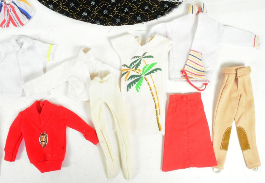 Sindy - a vintage Pedigree made Sindy doll with blonde hair and eyes to the right, numbered 033055X Clothes to include Tennis Player, Gala Ball Gown, Ballerina, Horse Rider and more.