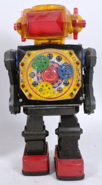 Tinplate Toys - a vintage Yonezawa Mechanic Robot. Featuring see-through gears, stop'n go action, rotating torso and space noise. Tested and is not in working order, however has a clean battery compartment. Housed within the original box, measuring approx. 32cm x 17cm, including the box.
