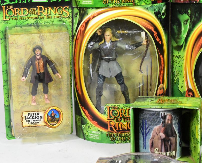 Lord of The Rings - a collection of Toy Biz figurines and merchandise relating to the Lord of The Rings movie, The Fellowship of The Ring. To include: a Boromir and Lurtz figure set, a Frodo figure set, a Peter Jackson figure and others. All believed to be housed within their original boxes.