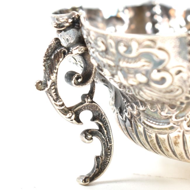 A Victorian 19th century Hallmarked silver footed bowl. Raised on scroll terminal supports with hoof feet, cast in relief. Hallmarked London 1889 by John Aldwinckle & Thomas Slater.