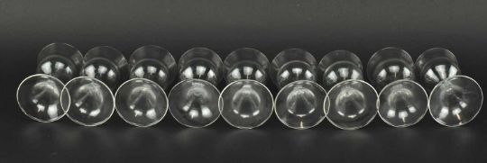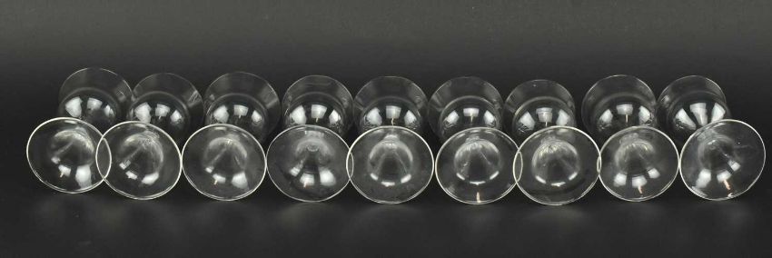 A collection of mostly vintage 20th century glass sherry and cordial glasses. The majority with hollow inverse trumpet stem. Along with four Pall Mall style cordial glasses and two earlier 19th century wine glasses with trumpet bowls, disc knopped stem over circular foot.