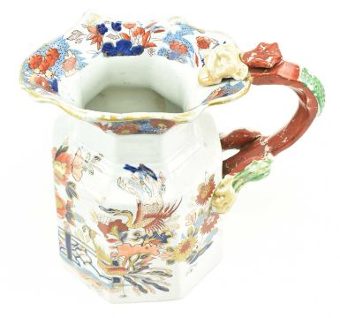 Two early 19th century pearlware figurines of the Widow of Zarapeth and the goddess Flora, along with a Mason's Ironstone Old Imari pattern jug / ewer. Each hand painted & with BADA customs label to underside. Some damage & restoration to the nose of the Widow fugrine, loss to the scales of the Hydra handle of the Imari jug.