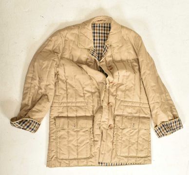 A collection of Men's wear and footwears. The lot to include a Gieves & Hawkes travelling tropical suit in beige, jacket size 46S, trousers 38, a M and S Sartorial - A England tailored made pure new wool men's double breasted black/grey stripes two piece suit, jacket size 42" chest, trousers size 36", an Italy made "Boudi"suede jacket, European size 52, a men's "Orvis" vest, size L, a vintage Aquascutum ladies' quilted jacket, size 12 regular and four pairs of men's leather shoes, all size 11.