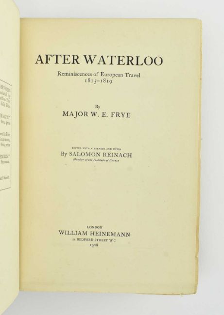 1904 Farthest North by Dr. Fridtjof Nansen, illustrated, publ. Archibald Constable and Co. Ltd.; 1847 Mary Anne Wellington, the Soldier's Daughter, Wife and Widow by the Rev. Richard Cobbold, second revised ed publ. Henry Colburn; 1895 On the Track of the Mail-Coach, being a Volume of Reminiscences by F. E. Baines publ. Richard Bentley and Son; 1903 Personal Reminiscences of the Duke of Wellington by Francis, the First Earl of Ellesmere publ. John Murray; and 1908 After Waterloo, Reminiscences of European Travel by Major. W. E. Frye publ. William Heinemann. All in publisher's orig. full cloth, some with prior ownership inscriptions / bookplates, light shelfwear otherwise a good collection. 8vo.