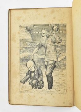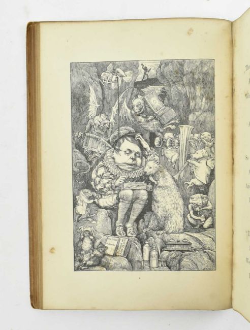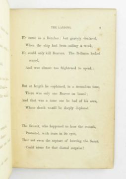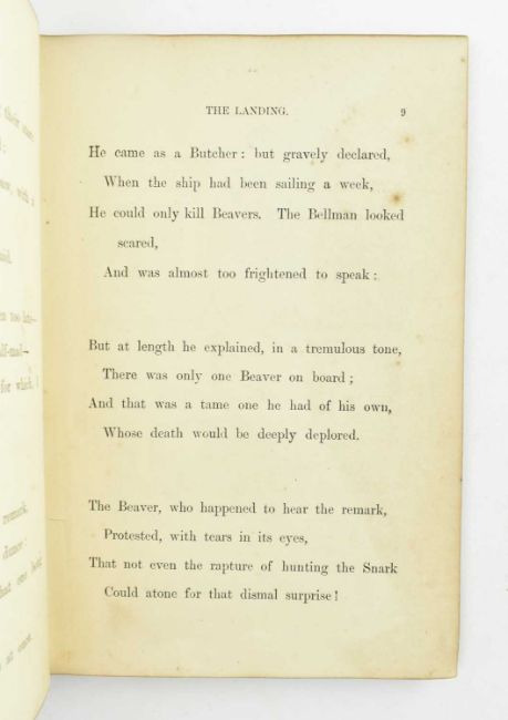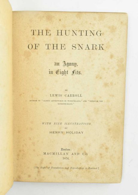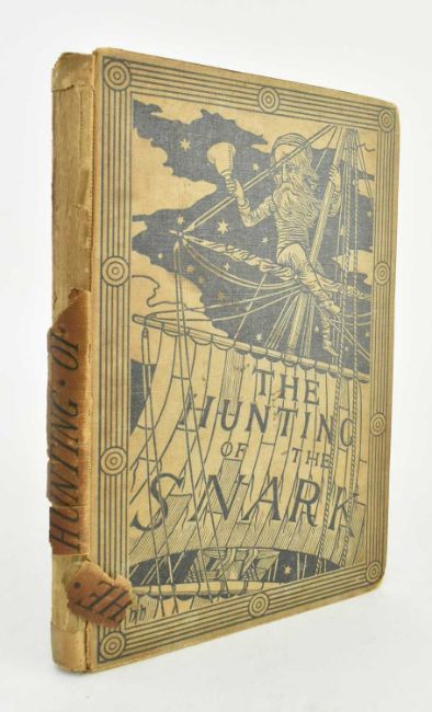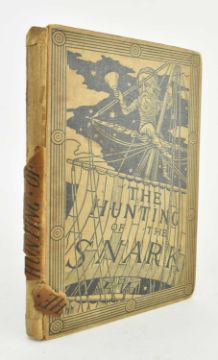 Carroll, Lewis. 1876 The Hunting of the Snark, an Agony in Eight Fits. First edition, first printing with error Baker for Butcher on page 83. Publ. Macmillan and Co., with nine illustrations by Henry Holiday. Publisher's orig. pictorial cloth, spine with loss of 3" to the head and 0.5" to the tail, rest of the spine loose at rear joint, spine cocked, extremities bumped and discoloured, all edges gilt, 20th century ownership inscr. to half title, tissue guard & frontispiece present, title page spotted and some spots & marks throughout. 8vo.
