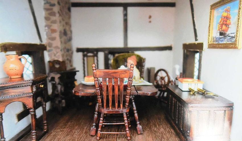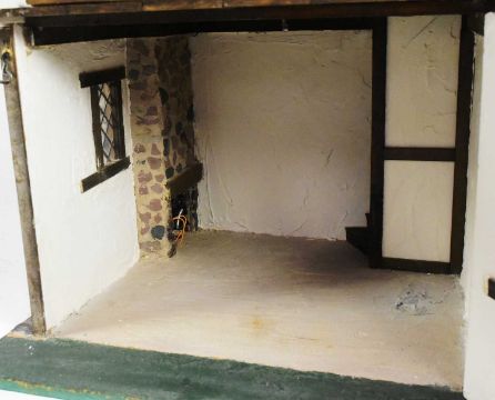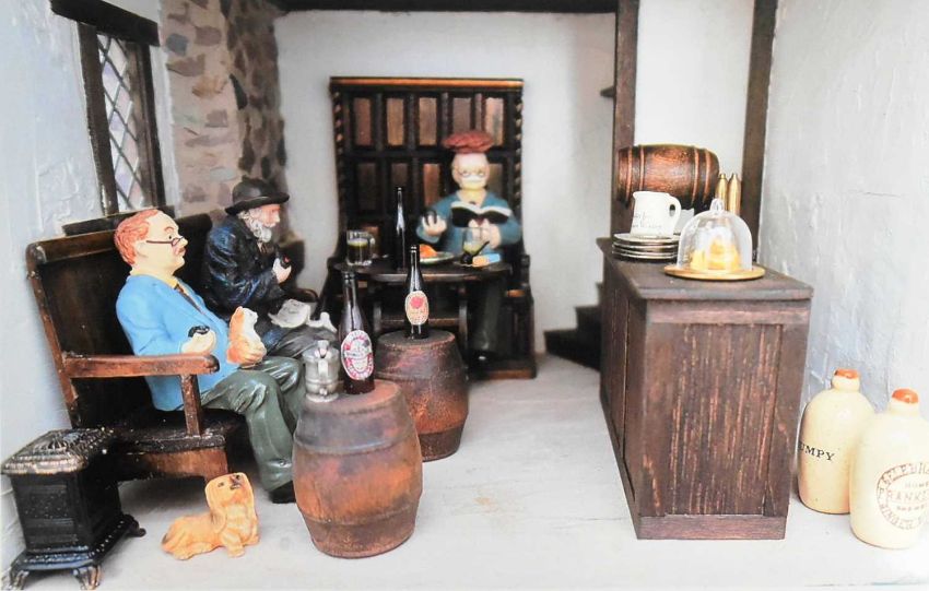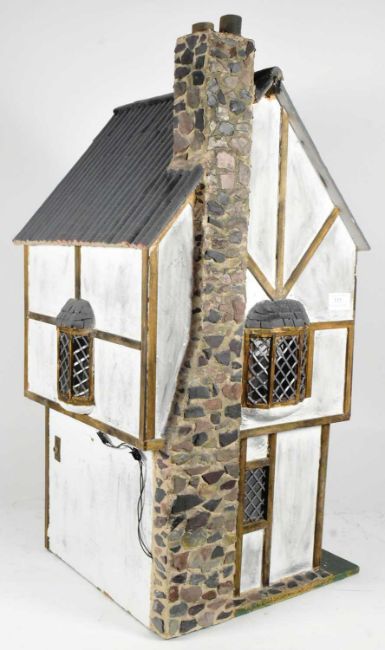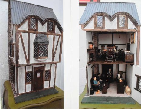 Dolls House - a hand made scratch built two storey wooden dolls house in the form of a pub. Tudor style exterior with leaded windows, lower level bar area with x3 pub customers, wooden furniture, barrels and bottles. The top floor dining area having a lady eating lunch. Highly detailed example. Measures approx