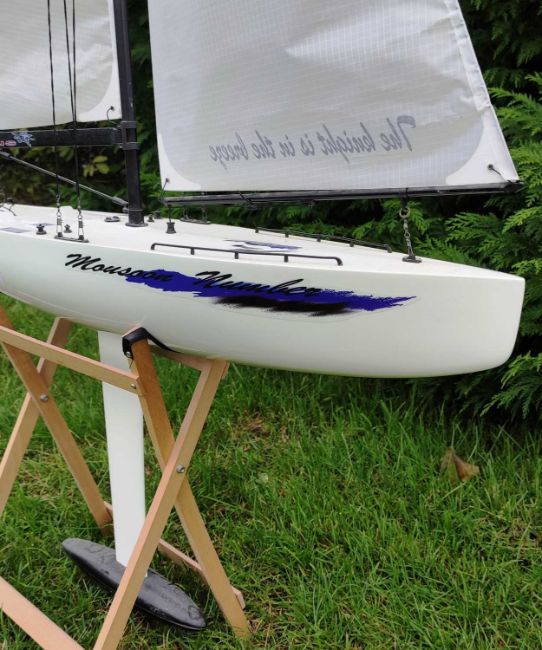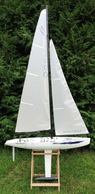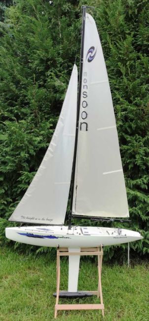 RC Models - a preassembled hand made Nauticus Monsoon RC Radio Controlled model pond yacht / sailing yacht. Fibreglass construction with hinged rigging and fitted with radio gear. Measures approx 90x170cm.