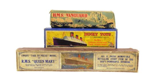 Antique Toys - a collection of early 20th Century model toys of nautical / ship interest comprising; Dinky Toys No. 52S Cunard White Star Liner Queen Mary, Chad Valley ' Take To Pieces ' model of RMS Queen Mary and Crescent Toys HMS Vanguard.