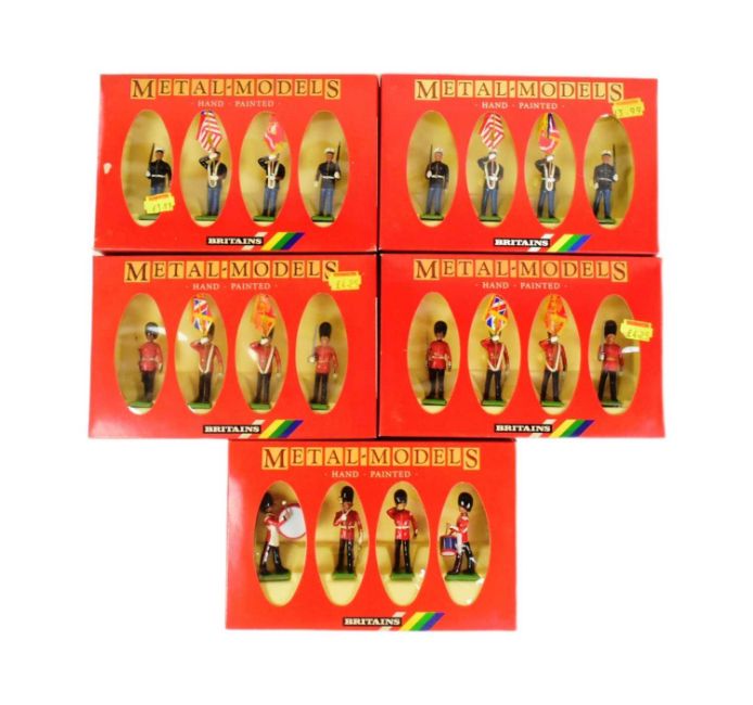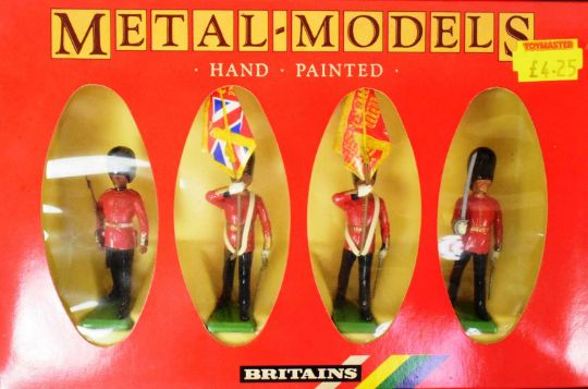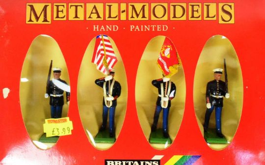 Model Soldiers - a collection of x5 vintage Britains hand painted metal soldiers comprising; 7210 Scots Guards, 7249 Queens Colour Party and US Marine Corps.