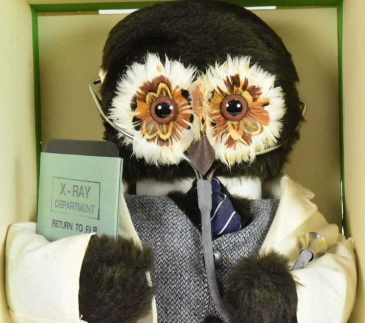 The London Owl Company - an original London Owl Company soft toy ' The Doctor '. The owl dressed in a white doctors uniform with stethoscope and X-Ray Department booklet. Housed in the original box. Measures approx 43cm.