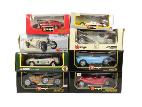Diecast - a collection of Burago 1/18 and 1/14 scale boxed diecast models to include; Lanciqa Aurella B24 Spider, Bugatti Grand Prix 1935, Mercedez Benz 500K Roadster and others.