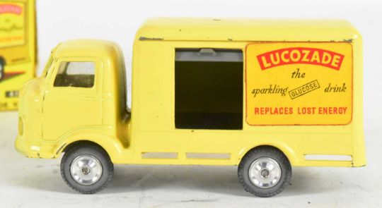 Diecast - an original vintage Corgi Toys boxed diecast model No. 411 Karrier ' Bantam ' Lucozade Van. Yellow body with grey shutter and Lucozade decals. Appears G+ within original box.