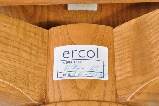 • Ercol Furniture - Contemporary Ercol beech and elm wood Windsor dining table and chairs. The chairs with lathe backs and pad seats, dining table raised on column and splayed leg base