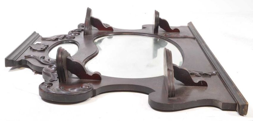 A 19th century Art Nouveau mahogany carved overmantel mirror. Kidney form central glass panel with carved floral relief detail to ground, with various trinket shelves and oval smaller mirror.