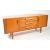 British Modern Design - Mid century teak veneer sideboard credenza. Banik of three drawers to centre, flanked by cupboard doors with shelved interior. Raised on stumped tapering circular legs, shaped pull handles.