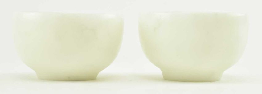 A collection of four Chinese soapstone carved items. The lot comprising a pair of white stone tea bowls, a soapstone cup with twin ring handles, and a larger bowl.