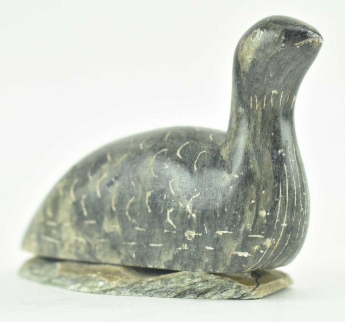 A mid 20th century Canadian Inuit hand carved stone bird figurine. The bird modelled seated, hand engraved feathers & mounted on slate base. Signed & dated to underside Dimu 1964.