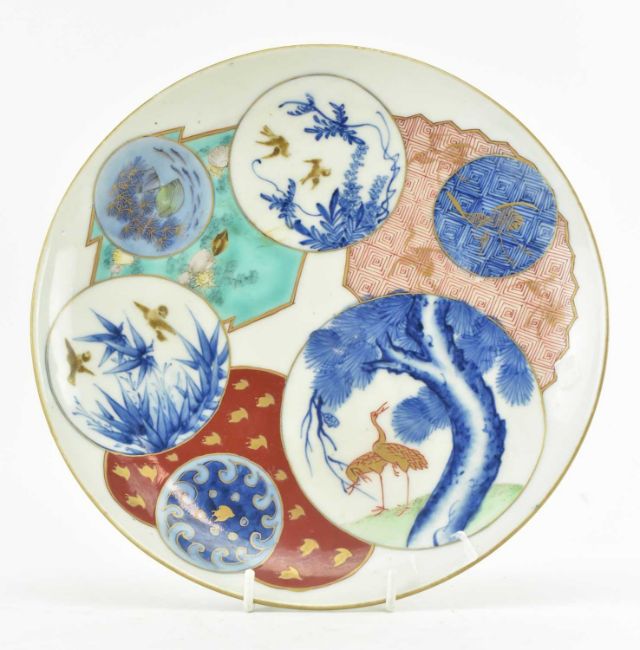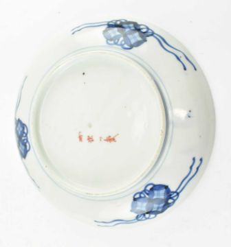 A collection of five Chinese and Japanese 18th century & later blue and white plates. The lot comprising an Arita style plate with vignette scenes of storks, a Chinese export plate with pagoda design, a soup plate with floral central decoration, a Qianlong plate with tree and fence, and a famille rose plate with hand painted flowers, teal painted rim. Some occ. hairlines.