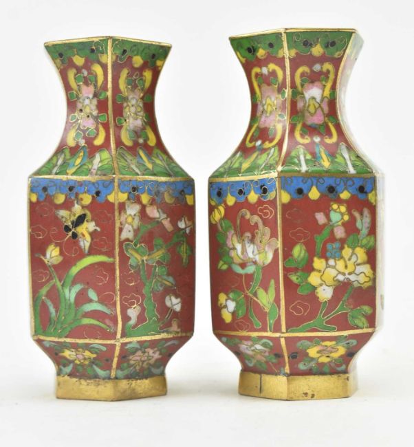 A pair of 19th century Chinese small cloisonne enamelled vases of hexagonal form. The vases on maroon ground with enamel floral and foliate design. Blue interior and underside.