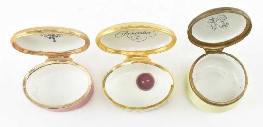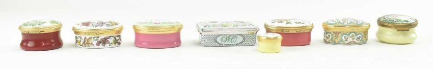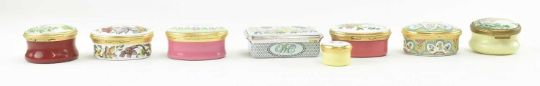 A collection of vintage enamel pill boxes, all Halcyon Days, Crummles or Bilston. The lot to include limited edition Halcyon Days unboxed 2011 Royal Wedding William and Catherine marriage example no. 59 of 500; Halcyon Days Royal Crescent a Trifle from Bath pill box replica of an 18th century Bilston enamel box, boxed and with Mallory label internally; 1978 St. Valentines Day Crummles circular pill box Bilston and Battersea Enamels, boxed; a Halycon Days Bilston and Battersea Je t'aime box, boxed; along with eight unboxed examples, comprising two Happy Anniversary examples, 1988 A Year to Remember example, For You with floral design, Do Not Be Sorry that Roses Have Thorns example, miniature strawberry example, and a Ruby Anniversary dated gift example.
