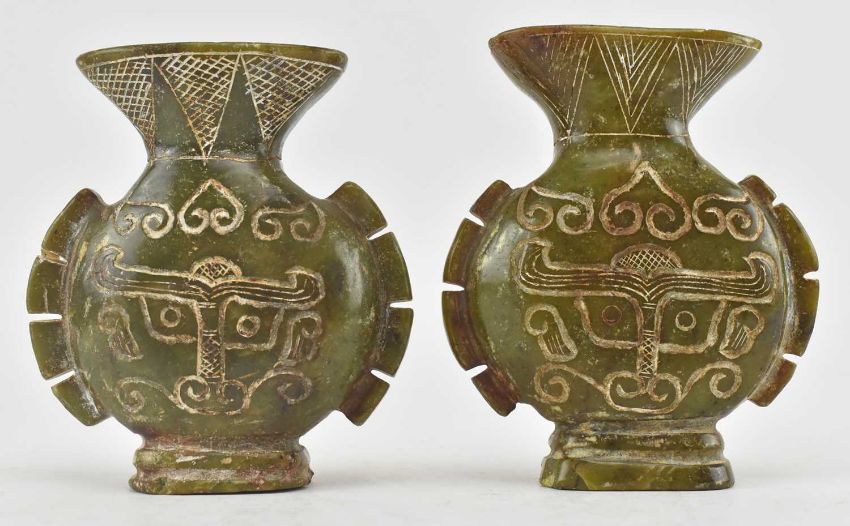 A pair of hand carved believed Chinese jadeite hardstone temple vases, along with a similar jadeite amulet. Each featuring hand carved scrolled & face design.