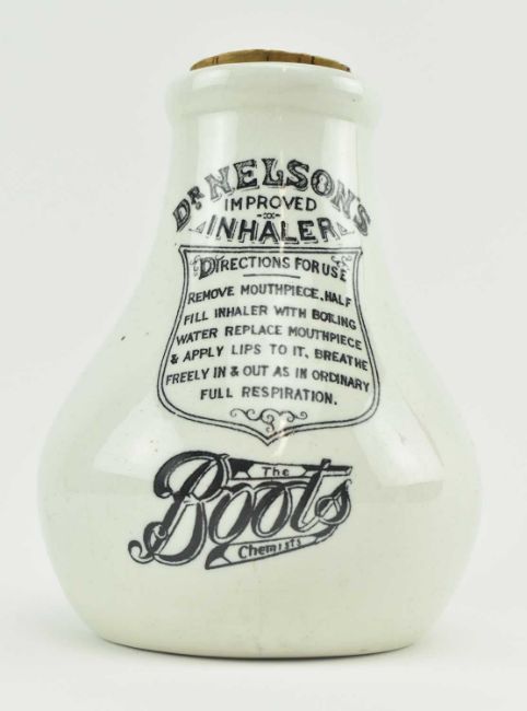 Two Victorian 19th century patented ceramic pieces. The lot to include Dr Nelson's Improved Inhaler, The Boots Chemists with directions for use to front. Together with Samuel Clarke's Pyramid Food Warmer with lid.