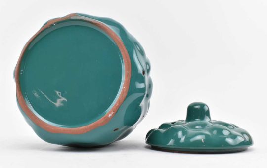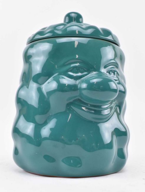 An unusual vintage green painted glazed terracotta lidded pot in the form of a potato man. The lidded pot with face & painted in green, two airing holes to lid. Unmarked.