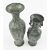 A pair of Chinese bronzed vases, each with relief design. Comprising a baluster vase with twin handles, character surround to neck & scenes of elders playing games, and a taller example with foliate design to neck & cartouche scenes of ladies. Each with four character mark to underside.
